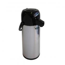 Pump button on top dispenses beverages and has pour/stop switch in back of top. Handle swings up for transporting and folds down for use. Great for business, home, dorm or office use. Vacuum glass liner ensures contents remain hot or cold for hours. In stock and ready to ship. Features: 2.5 liter capacity air pot. Plastic top, handle and base with brushed stainless steel jacket. The inside is glass lined, stainless steel outer body. Perfect for either commercial or home use. Specs: Dimensions: 16"H x 6 1/2"W. 2.5 liters = 84 oz. Heat Retention: 173ºF for 10 hours, 144º for 24 hours. .Images ScreenShot